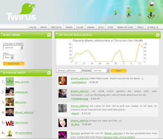 twirus_de Top5 der popularsten Leute: 1 @dm_alverde 2 @HMSzymek (Neu) 3 @textzicke (Neu) 4 @tweet_addiction 5 @FrauStromberg http://de.twirus.com 11 Dec 2009 from API
