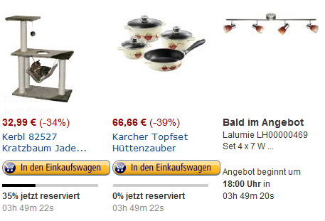 Bevorstehende Blitzangebote sind mit “In Kürze” sowie dem Zeitpunkt, an dem die Aktion beginnt, gekennzeichnet. Die Höhe des Aktionsrabattes wird jedoch erst zu Beginn der Aktion angezeigt.